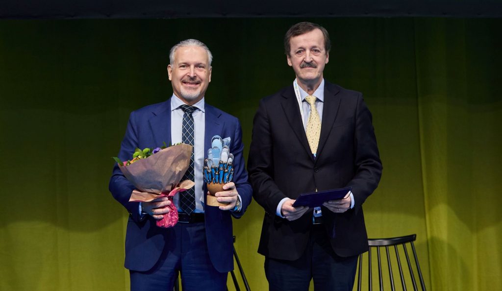 Lars Peter Lindfors on tehnyt merkittävän 36-vuotisen uran kemian ja kemian teknologian tutkijana ja johtajana uusiutuvien liikennepolttoaineiden kehittämisessä, palkitsija kiittää.