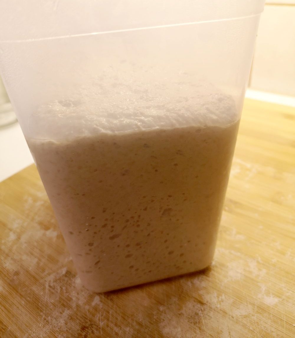 Kohota taikinaa korkeareunaisessa peitetyssä astiassa 3–4 tuntia. Sen jälkeen vaivaa tai taittele taikinaa varovasti parinkymmenen minuutin välein. Laita lopuksi peitetty taikinapytty jääkaappiin.